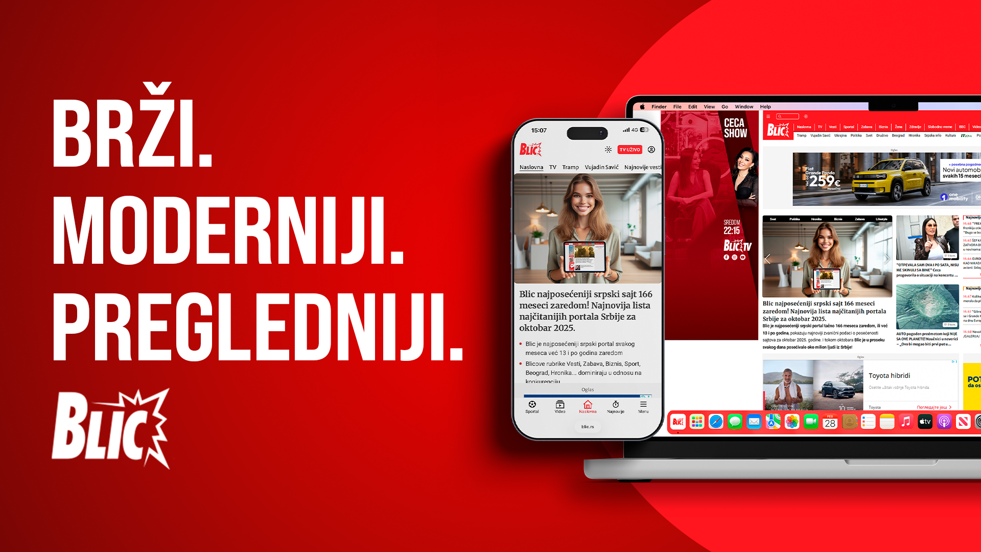 Sa ponosom predstavljamo novi Blic.rs! Lansirali smo redizajnirani portal koji donosi potpuno osveženo digitalno iskustvo za naše čitaoce: moderniji, brži i responzivniji dizajn – prilagođen svim uređajima, unapređena navigacija i pregledniji prikaz sadržaja i osvežen vizuelni identitet u skladu sa Ringier digitalnim standardima. Redizajn Blic.rs predstavlja važan korak u našem kontinuiranom razvoju sa jasnim ciljem da čitaocima pružimo kvalitetniji, brži i savremeniji način informisanja.